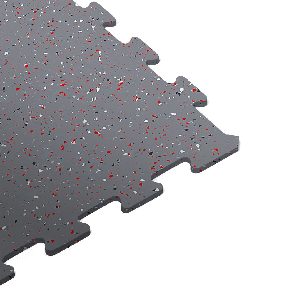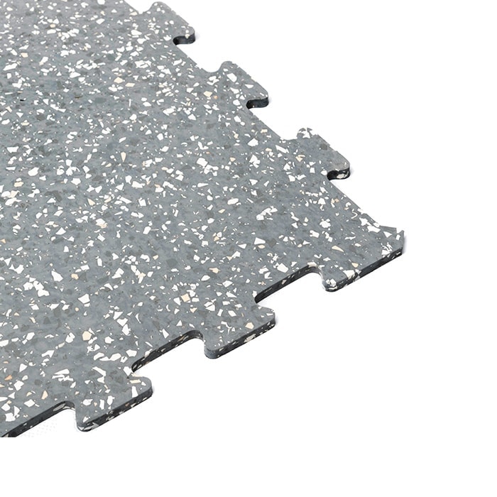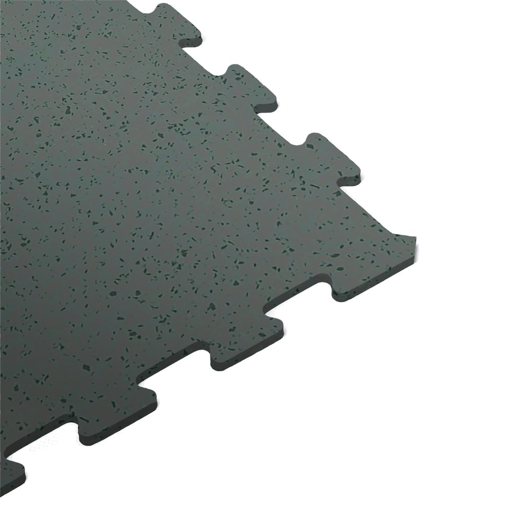 På grund af dette er hver enkelt flise prikket, hvilket betyder, at de er farvet med mange små prikker i samme eller forskellige farver. Sammenlignet med 9190-serien er dette gulv lidt mere porøst med mere greb. Overfladen forbliver vandtæt; den absorberer ikke vand og sved. Det er et gulv, der er velegnet til overdreven brug, til områder, hvor isotoniske maskiner og cardiomaskiner er placeret, men især ideelt til områder, hvor frie vægte bruges og tabes: håndvægte, kettlebells, vægtstænger. Det har ikke de samme rivebestandige egenskaber som andre genbrugsgulve i vores katalog, # 9201, 9202. Alligevel gør gummitypen (og dens dæmpende egenskaber) kombineret med det prikkede design, at disse fliser let kan modstå vægtenes påvirkning.