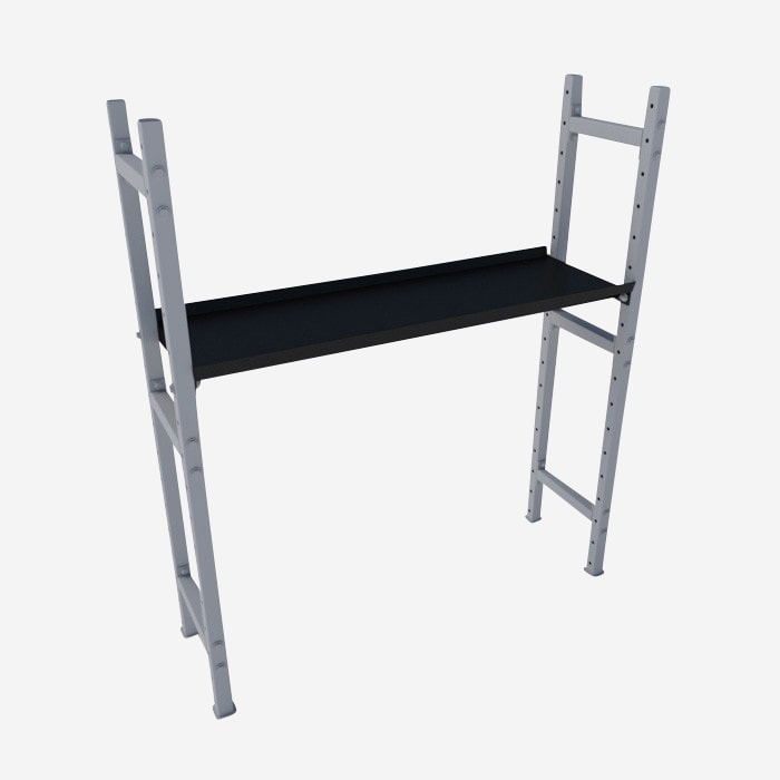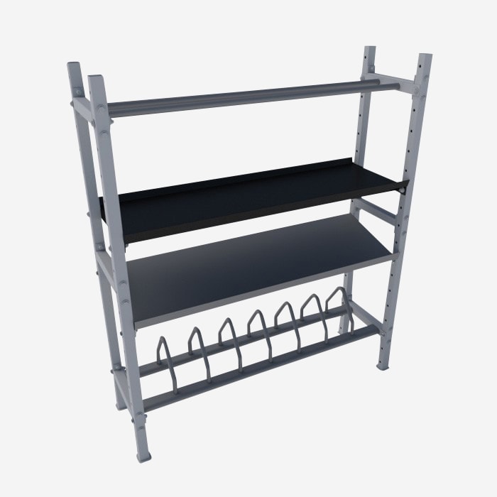 Gummibelagt universalhylde til opbevaring af alle slags redskaber eller genstande, tunge eller ej. Den rillede gummibelægning sikrer, at alt, hvad der placeres, ligger fast og dæmper støj. En 40 mm kant forhindrer, at redskaberne falder ned fra stativet, men er samtidigt ikke højere, end at det er let at placere dem på hylden efter brug.